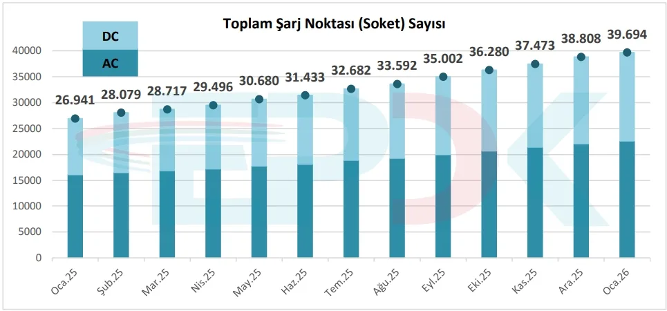 Şarj ağının toplam kurulu gücü Ocak 2026’da 2.990 megavat düzeyine çıktı. Geçen yıl birebir periyotta bu bedel 1.814 megavattı. Böylelikle altyapı kapasitesinde yaklaşık yüzde 64,8 artış kaydedildi.