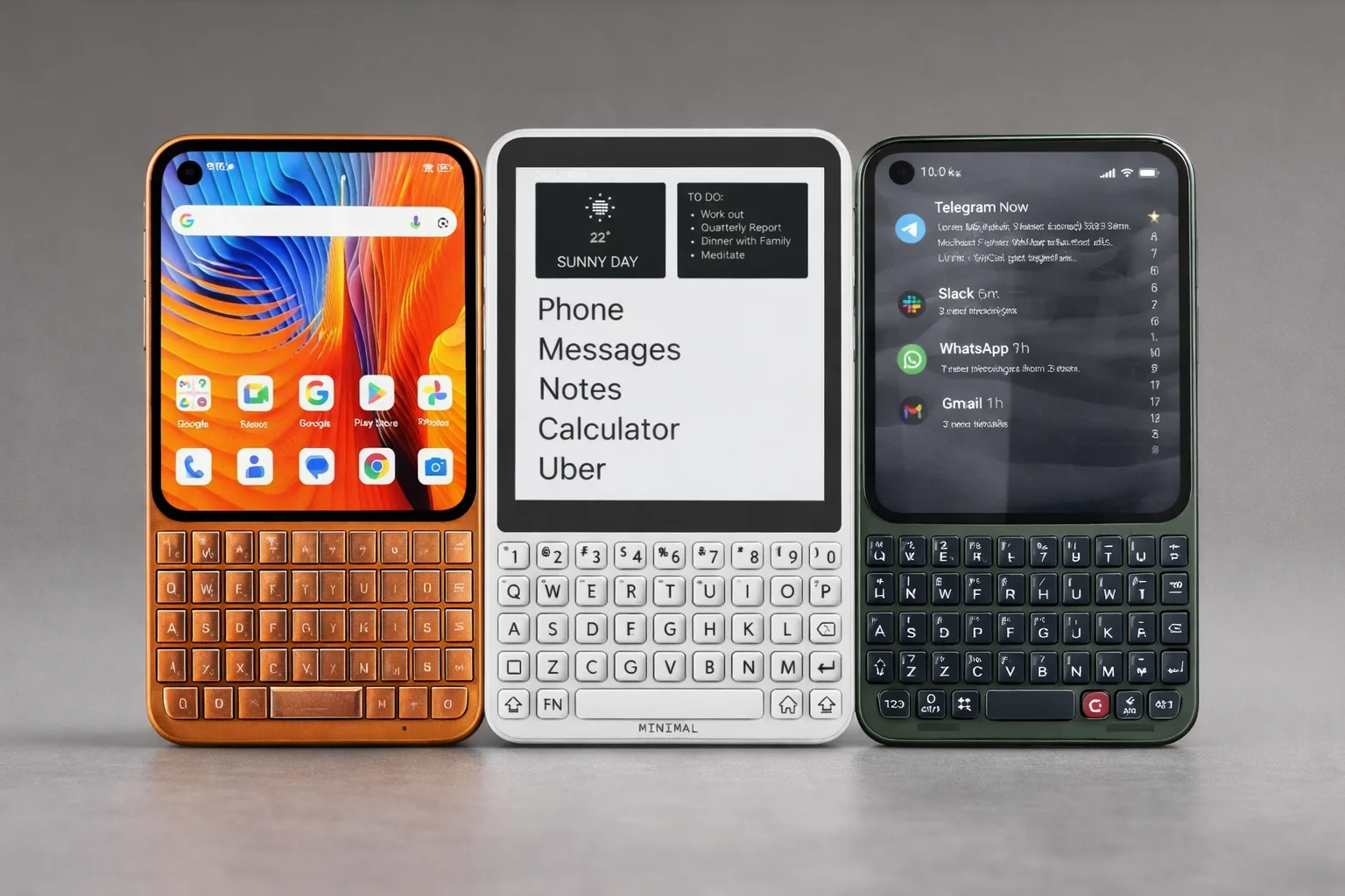 Üçlü içindeki en farklı aygıt ise Minimal Phone. Fast Company, bu modeli sonsuz kaydırma alışkanlığından uzaklaşmak isteyen kullanıcılar için konumlandırıyor. Aygıt, fizikî QWERTY klavyeyi e-kitap okuyucularda gördüğümüz yüksek kontrastlı e-paper ekranla bir ortaya getiriyor. Minimal’ın resmi teknik sayfasına nazaran telefonda 4,3 inç 230 ppi e-paper dokunmatik ekran, 35 tuşlu fizikî klavye, MediaTek Helio G99 işlemci, 4G LTE ilişkisi, 3000 mAh batarya ve Google Play takviyeli Android tabanlı yapı bulunuyor. Fast Company haberi aygıtın başlangıç fiyatını yaklaşık 399 dolar olarak veriyor.