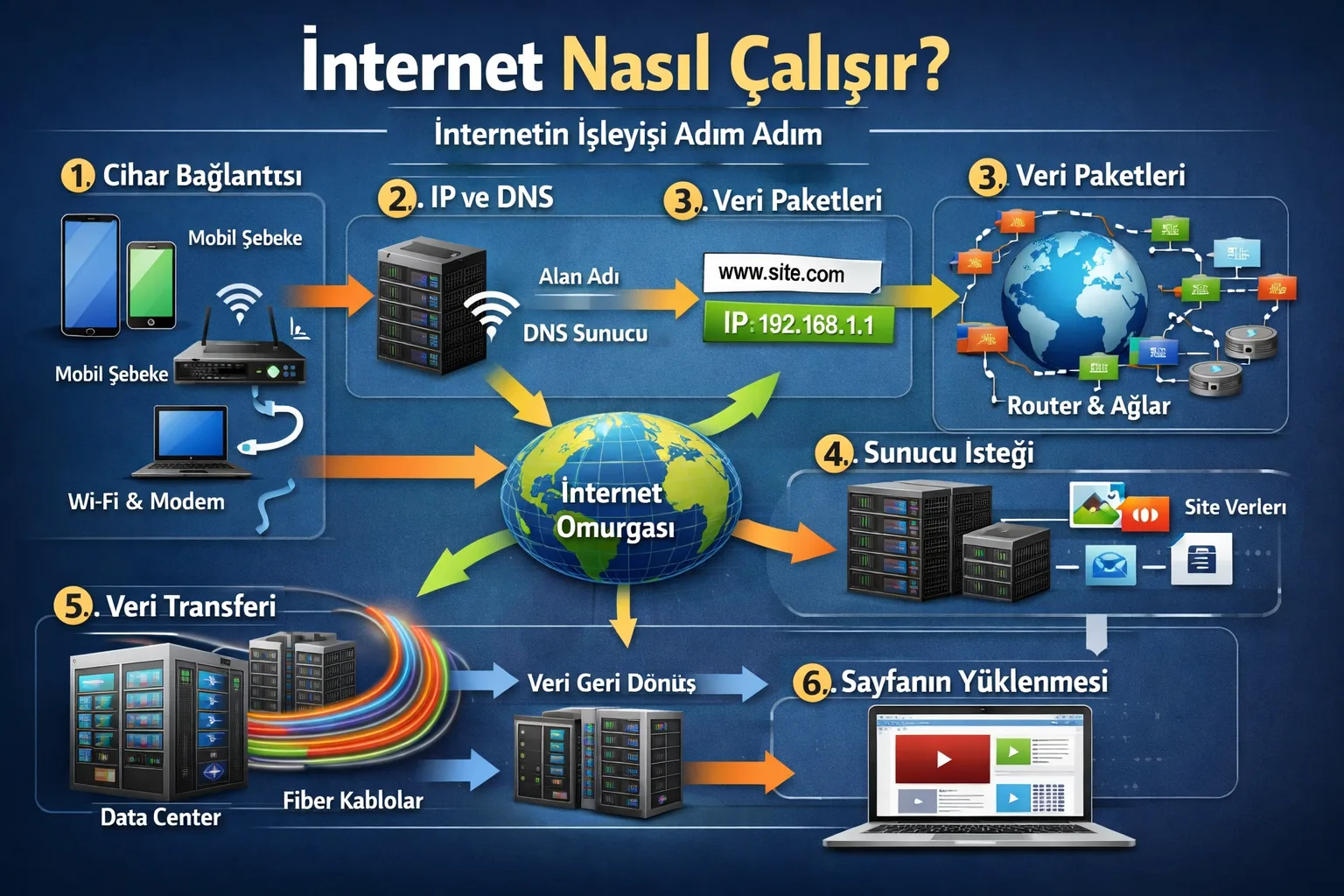 Her gün saniyeler içinde yaptığımız süreçler, aslında global ölçekte çalışan bir mühendislik mükemmelinin sonucudur. Bir web sitesinin açılması, iletinin karşı tarafa ulaşması ya da görüntünün takılmadan oynatılması; ağın farklı katmanlarının kusursuz biçimde birlikte çalışmasına bağlıdır. İnternet görünmez olabilir, ancak çağdaş hayatın en güçlü ve en somut altyapılarından biridir.