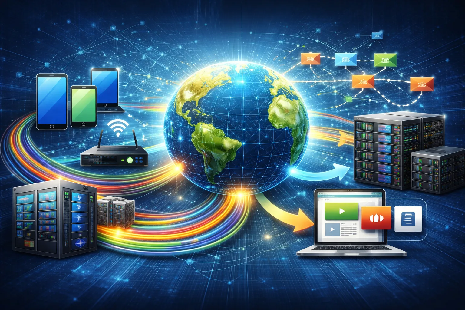 İnternetin özü, bir aygıttan çıkan datayı gerçek maksada ulaştırmak ve oradan gelen karşılığı yeniden yanlışsız halde kullanıcıya geri getirmektir. Lakin bu kolay tarifin ardında son derece gelişmiş bir mimari yer alır. Adresleme sistemleri, yönlendirme kuralları, sunucular, bilgi merkezleri, kablolar, baz istasyonları ve güvenlik protokolleri olmadan bugünkü internet tecrübesi mümkün olmazdı.