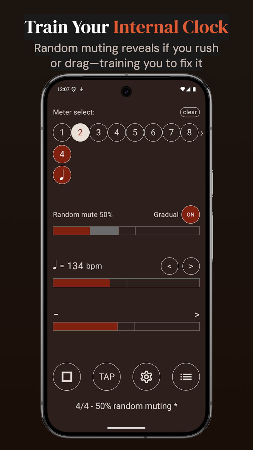 Time Guru ritim hissinizi geliştirmek için eşsiz bir sistem kullanıyor. Uygulama muhakkak vuruşları rastgele susturarak kendi iç zamanlamanızı test etmenizi sağlıyor. Bu nedenle müzikal bağımsızlığınızı artırmak için piyasadaki en tesirli araçlardan biri sayılıyor. Profesyonel eğitimciler bu formülü şiddetle tavsiye ediyor.